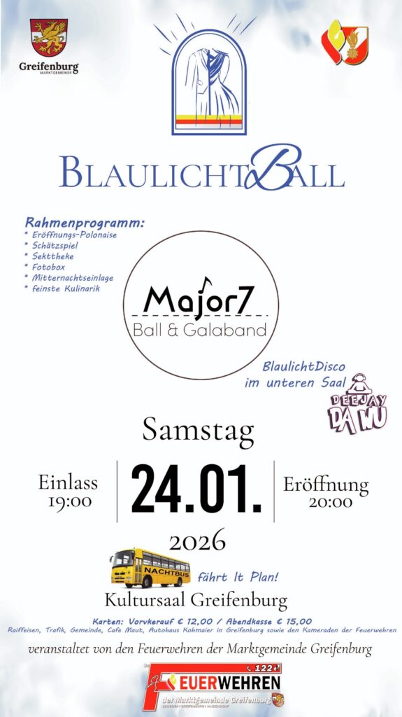 Einladung zum Blaulichtball der drei Feuerwehren unserer Gemeinde / News, Wichtig / Von Gemeinde Greifenburg Verwandte News Stellenausschreibung – Bademeister weiterlesen Kostenlose Vorsorge-Broschüre weiterlesen Schneespaß und Wintersport weiterlesen Greifenburger Faschingsumzug am 14. Feber 2026 weiterlesen Abschluss Skikurs Kindergarten weiterlesen