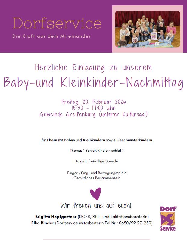 Baby- und Kleinkindernachmittag + Zu Google Kalender hinzufügen + iCal / Outlook export Datum 20 Feb. 2026 Uhrzeit 15:30 - 18:00 Veranstaltungsort unterer Kultursaal Hauptstraße 240, Greifenburg Website https://greifenburg.gv.at/ Kategorie Gesellschaft Veranstalter Dorfservice Telefon 0650/9922250 E-Mail drautal@dorfservice.at Teile diese Veranstaltung