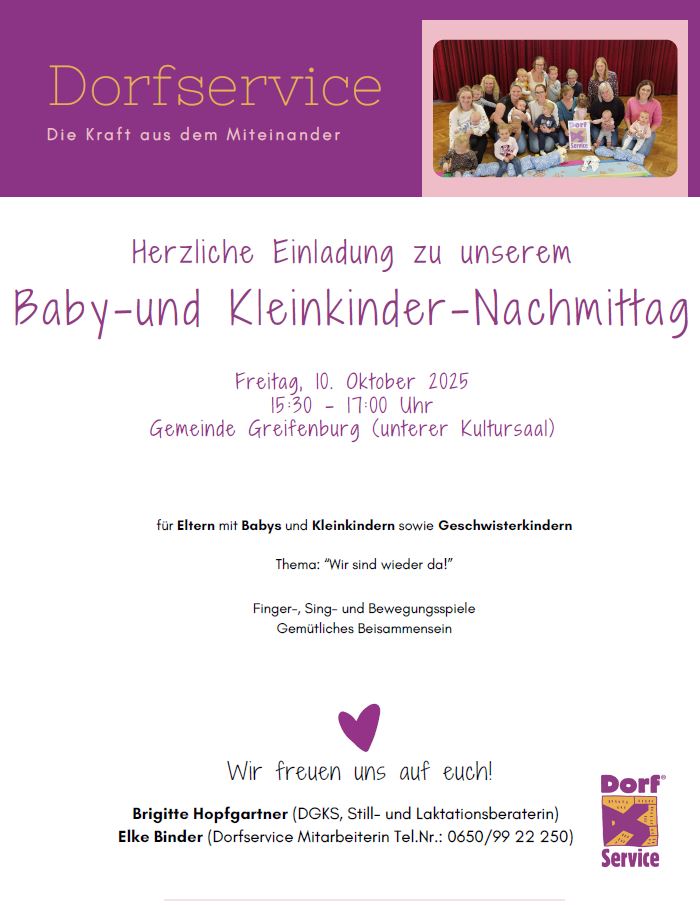 Baby- und Kleinkindernachmittag + Zu Google Kalender hinzufügen + iCal / Outlook export Datum 10 Okt. 2025 Uhrzeit 15:30 - 17:00 Veranstaltungsort unterer Kultursaal Hauptstraße 240, Greifenburg Website https://greifenburg.gv.at/ Kategorie Gesellschaft Veranstalter Dorfservice Telefon 0650/9922250 E-Mail drautal@dorfservice.at Teile diese Veranstaltung
