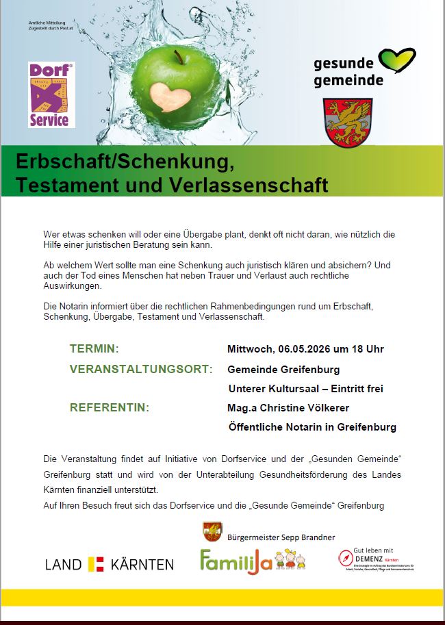 Erbschaft/Schenkung, Testament und Verlassenschaft + Zu Google Kalender hinzufügen + iCal / Outlook export Datum 06 Mai 2026 Uhrzeit 06:00 Veranstaltungsort unterer Kultursaal Hauptstraße 240, Greifenburg Website https://greifenburg.gv.at/ Kategorie Gesellschaft Veranstalter Marktgemeinde Greifenburg Telefon +43 4712 2160 E-Mail greifenburg@ktn.gde.at Website https://greifenburg.gv.at/ Teile diese Veranstaltung