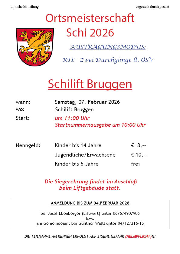 Ortsmeisterschaft im Schifahren 2026 + Zu Google Kalender hinzufügen + iCal / Outlook export Datum 07 Feb. 2026 Vorbei! Uhrzeit 10:00 Veranstaltungsort Skilift Bruggen Kategorie Sportveranstaltung Veranstalter Marktgemeinde Greifenburg Telefon +43 4712 2160 E-Mail greifenburg@ktn.gde.at Website https://greifenburg.gv.at/ Teile diese Veranstaltung