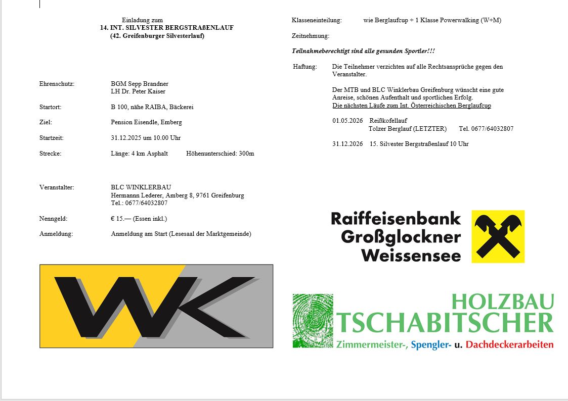 Silvester Bergstraßenlauf + Zu Google Kalender hinzufügen + iCal / Outlook export Datum 31 Dez. 2025 Vorbei! Uhrzeit 10:00 Veranstaltungsort Neben B100 Website https://greifenburg.gv.at/ Kategorie Sportveranstaltung Veranstalter MTB (Mountainbike) + BLC Winklerbau Telefon +43 677 64032807 Website https://greifenburg.gv.at/ Teile diese Veranstaltung