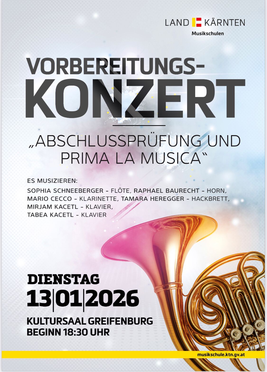 Vorbereitungskonzert Abschlussprüfung und Prima la musica + Zu Google Kalender hinzufügen + iCal / Outlook export Datum 13 Jan. 2026 Uhrzeit 18:30 Veranstaltungsort oberer Kultursaal Hauptstraße 240, Greifenburg Website https://greifenburg.gv.at/ Kategorie Konzert Veranstalter Musikschule Oberes Drautal Telefon +43 4712 8121 E-Mail paul.moser@musikschule.at Website https://musikschule.ktn.gv.at/musikschulstandorte-des-landes/04-Musikschule-Oberes-Drautal Teile diese Veranstaltung